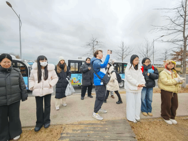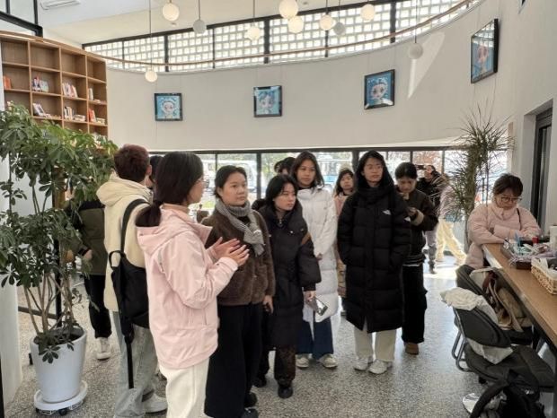 随后,调研团队将课堂搬到实践一线,让设计创意扎根现实土壤。1月19日的上海,阴雨绵绵、寒意袭人,视觉传达系教师党支部强国行专项行动团队负责人牛玉慧老师和14名师生组成的调研团队满怀热情,来到了上海市金山区漕泾镇水库村。此次调研以“专家讲解+实地探访”为核心形式,围绕十余个在地设计选题展开深度探索,选题涵盖漕泾郊野公园文创旅游纪念品开发、休闲水庄婚礼品牌打造与产业孵化、朱漕路流动风景线设计、阮巷老街文化挖掘与品牌塑造等多个维度。师生们行走在水库村的人文与乡野交融空间中,沉浸式捕捉设计灵感,细致记录所思所感。作为“学术实践+在地创新”开放式平台,“水窠里・大学村”自2025年3月开村以来,已汇聚百余名国内外高校学子践行“论文写在大地・设计做在乡村”的理念。中原工学院艺术设计学院视觉传达教师党支部积极响应乡村振兴号召,主动融入这一乡村创新实践平台。调研中,师生们与选题方面对面交流,聆听行业专家深度剖析,精准厘清各选题核心需求与设计要点,在实践交流中收获颇丰。