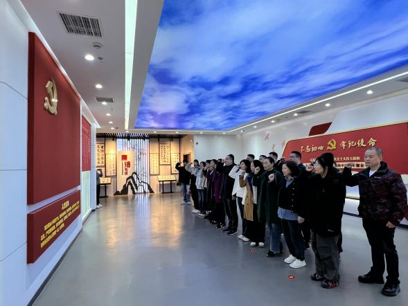 随后,研学团队来到了郑州航空港经济综合实验区廉洁文化教育中心,认真学习了“关键抉择 引领航向”“砥砺前行一严到底”、“不忘初心正道直行”和“守正出新 行稳致远”四个篇章的内容,观看了典型案例视频和部分违纪违法典型案例,深刻感受到警示教育的直观感和冲击力。参观结束后,全体教师党员和学生党员代表进行了重温入党誓词活动。