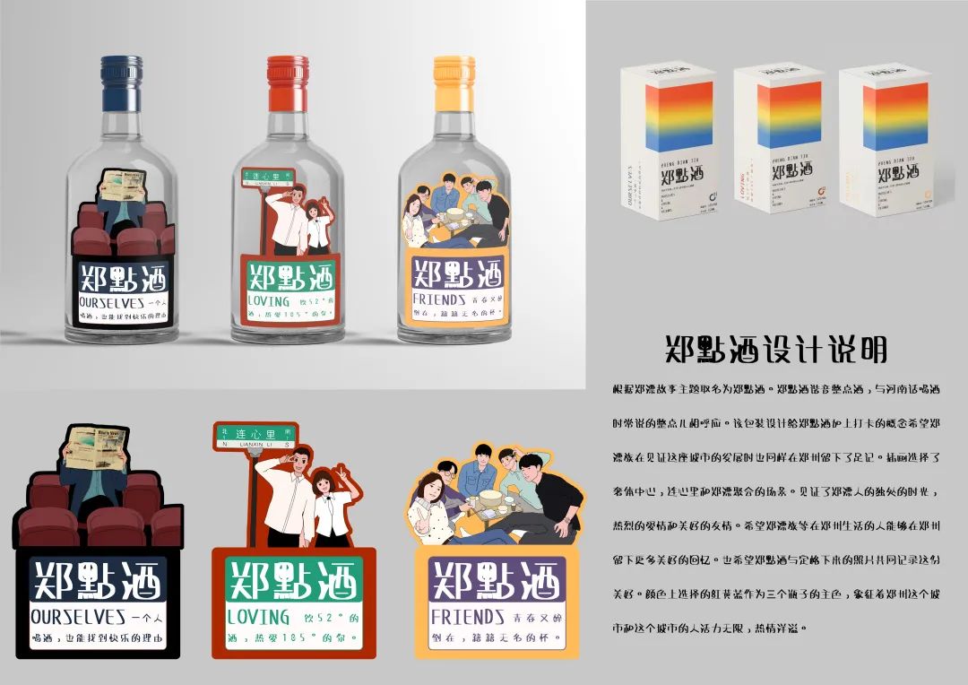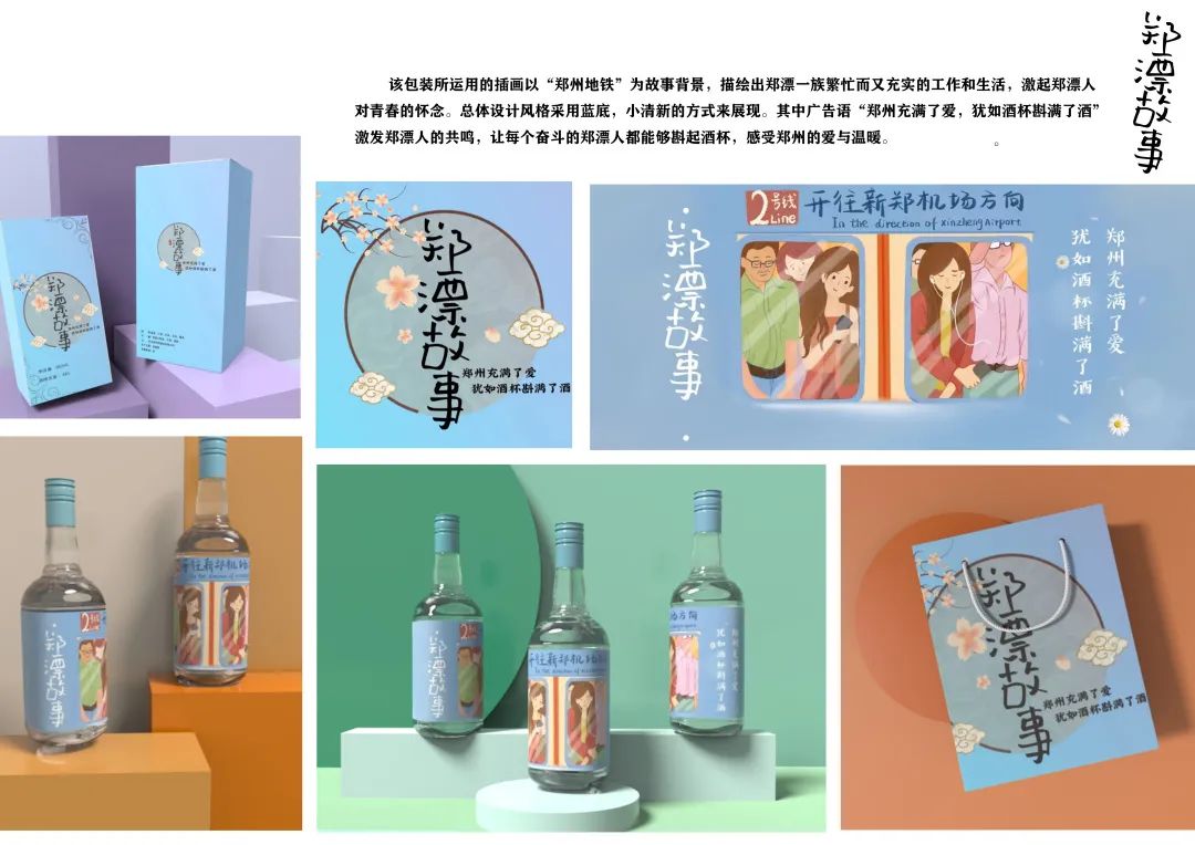 “郑漂故事”白酒主题创意大赛是由我院举办、河南壹筑实业有限公司赞助的主题类创意设计大赛,大赛发心于为郑州打造“城市礼物”的初衷,谋求助力郑州高质量发展,致力于新型的产教融合、课程与项目对接,是我院省级一流课程《品牌与企业形象设计》课程核心理念的体现。首届大赛作为尝试,定向面向省内高校征集作品,获得了省内多所高校的响应和支持,短时间内共收到各类有效参赛作品300余件套。