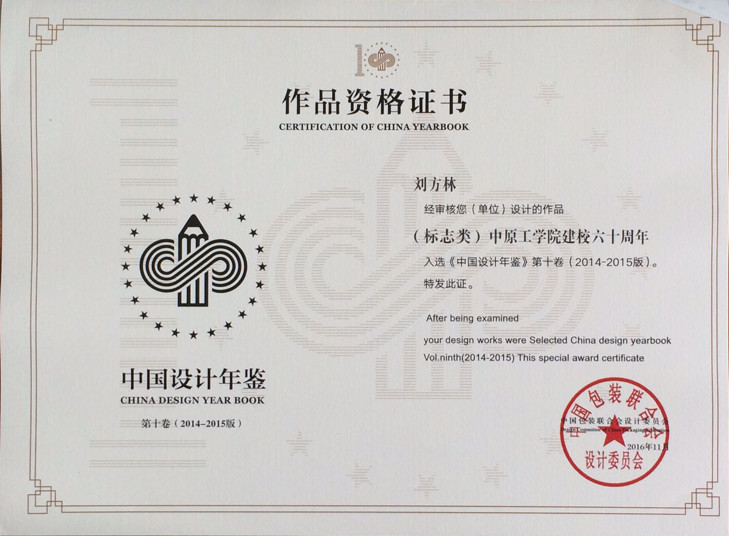近日,《中国设计年鉴》第十卷(2014-2015版)入选作品名单公布,我院教师刘方林设计的中原工学院校庆六十周年标志入选其中。