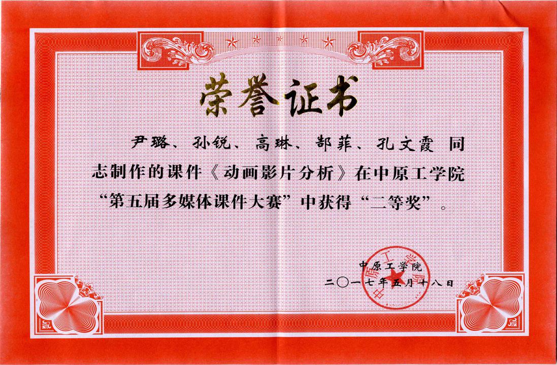 2017年5月在学校媒体课件大赛即将进行前,学院领导高度重视,经过学院反复筛选,派出2个作品参赛,最终有动画教研室派出的团队获得了中原工学院“第五届多媒体课件大赛”二等奖。