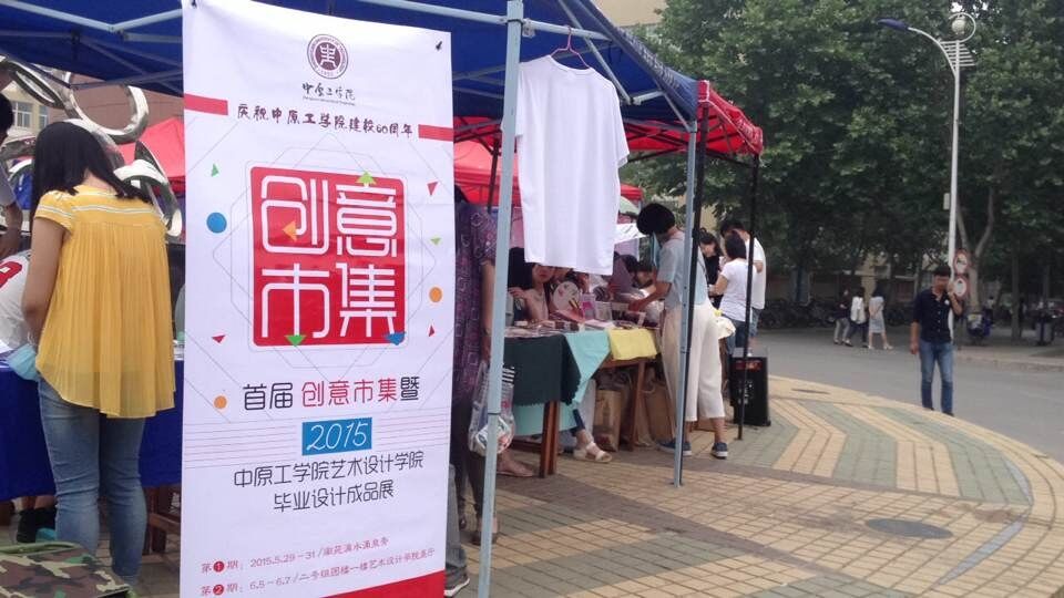 2015中原工学院艺术设计学院,视觉传达专业毕业设计成品展暨首届学生原创作品创意市集,于5月29日成功开办,本次创意市集分为两期,第一期的举办时间为5月29-31日、地点在滴水涌泉旁,第二期的举办时间为6月4-6日、地点在艺术设计学院展厅。