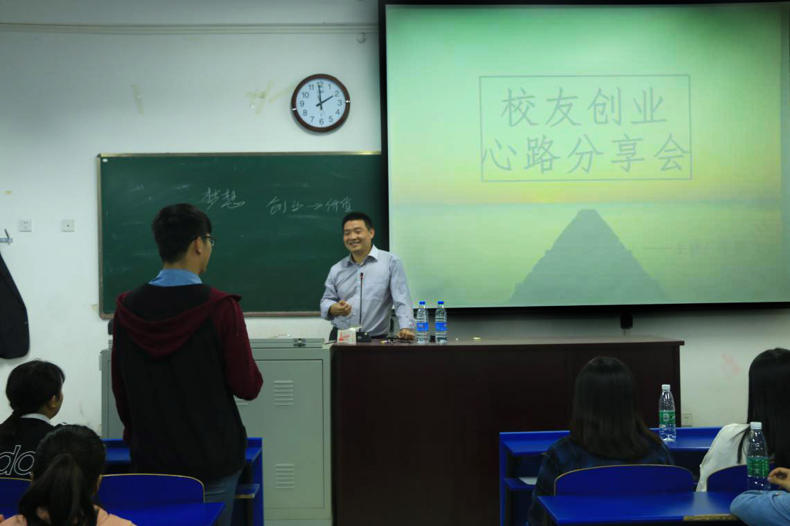 2015年10月17日下午2时,我院迎校庆系列活动之——“校友创业心路分享会”在我校南区二号组团111教室举行。我院返校校友装潢98届毕业生、TATA木门郑州分公司经理张鹏飞与我院一百多名学生一起分享创业心路,艺术设计学院副院长南政、团总支副书记孙贺出席了分享会。