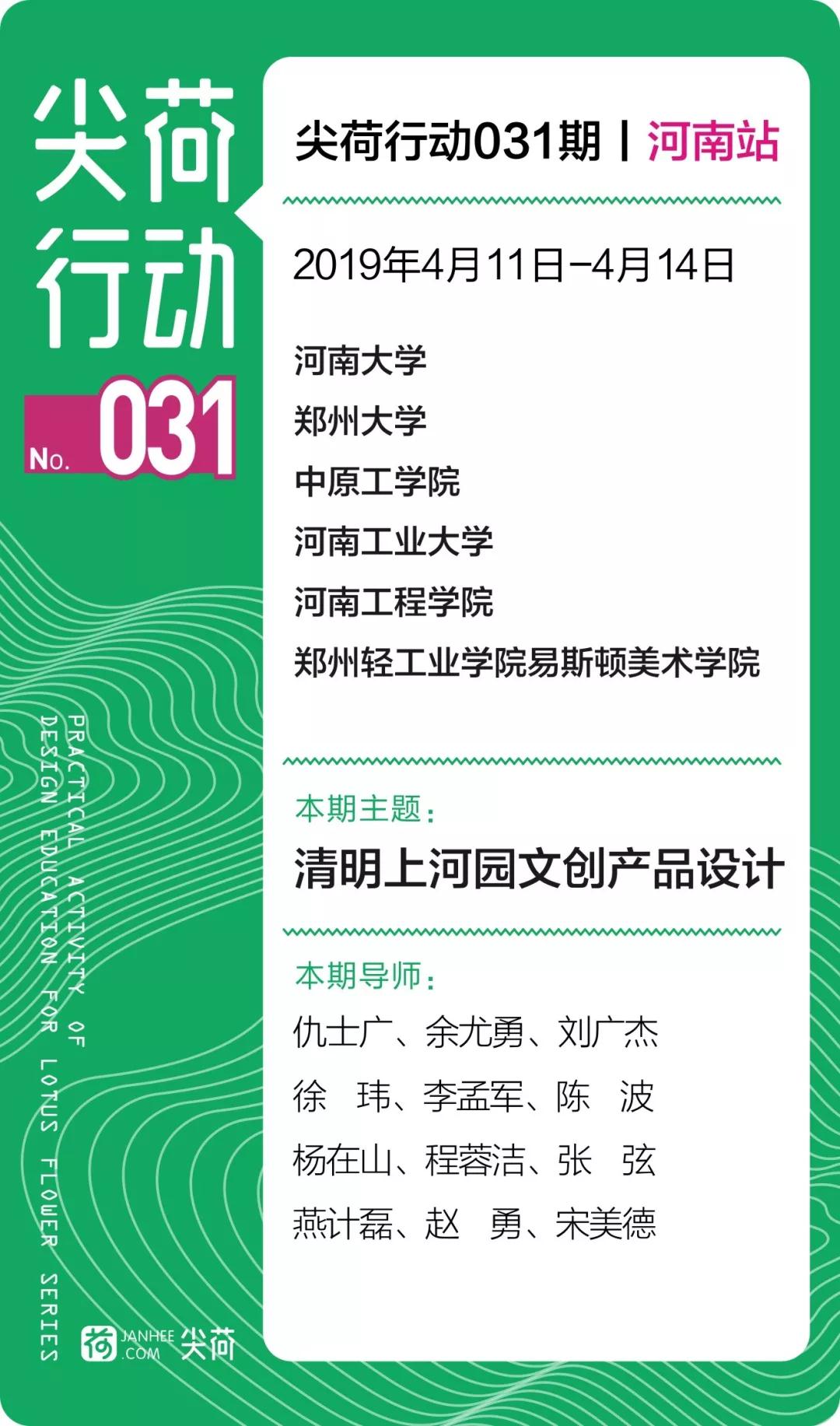 活动自4月11—14日,共有来自江苏的知名设计师仇士广、四川的知名设计师余尤勇,北京的知名设计师刘广杰,辽宁的知名设计师徐玮,河南的知名设计师李孟军、赵勇、宋美德,内蒙古的知名设计师杨在山、湖北的知名设计师程蓉洁、张弦,河北的知名设计师燕计磊、湖南的知名设计师陈波共计12位设计实战导师,将带领省内六所高校的12组优秀学生,针对“清明上河园文创产品设计”主题进行实战创作。
