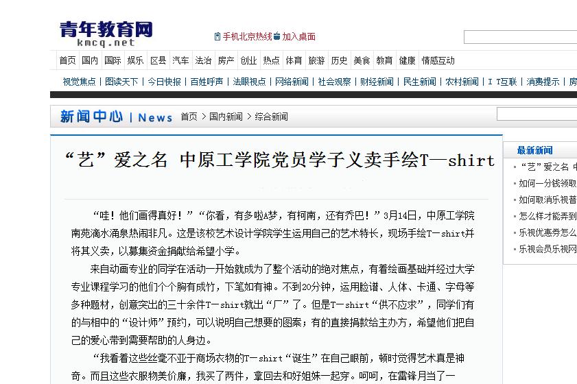 2015年3月14日,艺术设计学院13、15级学生党支部的同学运用自己的艺术特长,现场手绘T-shirt并将其义卖,以募集资金捐献给四川省乐山市马边县民主乡麦格希望小学。当日,义卖现场中原工学院南苑滴水涌泉热闹非凡,来自艺术设计学院的同学在活动一开始就成为了整个广场的焦点,有着绘画基础并经过大学专业课程学习的他们个个胸有成竹,下笔如有神。不到20分钟,运用脸谱、人体、卡通、字母等多种题材,创意突出的三十余件T-shirt就“出厂”了。但是T-shirt“供不应求”,同学们有的与相中的“设计师”预约,可以说明自己想要的图案;有的直接捐款给主办方,希望他们把自己的爱心带到需要帮助的人身边。义卖现场还吸引了不少老师前来。艺术设计学院和纺织学院的四名女教师结伴而来,对这些手绘T-shirt爱不释手,也不禁向学生们竖起了大拇指。第二天,以“你献爱心,我送摄影作品”的形式在全校范围内继续募捐。截止3月15日中午12:00,此次共义卖手绘T-shirt40余件,现场募集资金572元,这些资金将通过该校爱心超市送给四川省乐山市马边县民主乡麦格希望小学。此次活动对广大学生党员进行了一次很好的感恩教育,培养了该系学生党员“爱与奉献”的精神,增强了他们的社会责任感、使命感和服务社会、奉献社会的意识;提高了他们的自身综合素质和服务奉献社会的积极性,为充分发挥党组织的战斗堡垒作用和党员的先锋模范作用打下了坚实的基础。