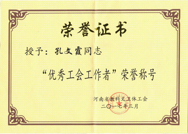 艺术设计学院分工会主席孔文霞老师在2017年3月被河南省教科文卫体工会授予“优秀工会工作者”荣誉称号。