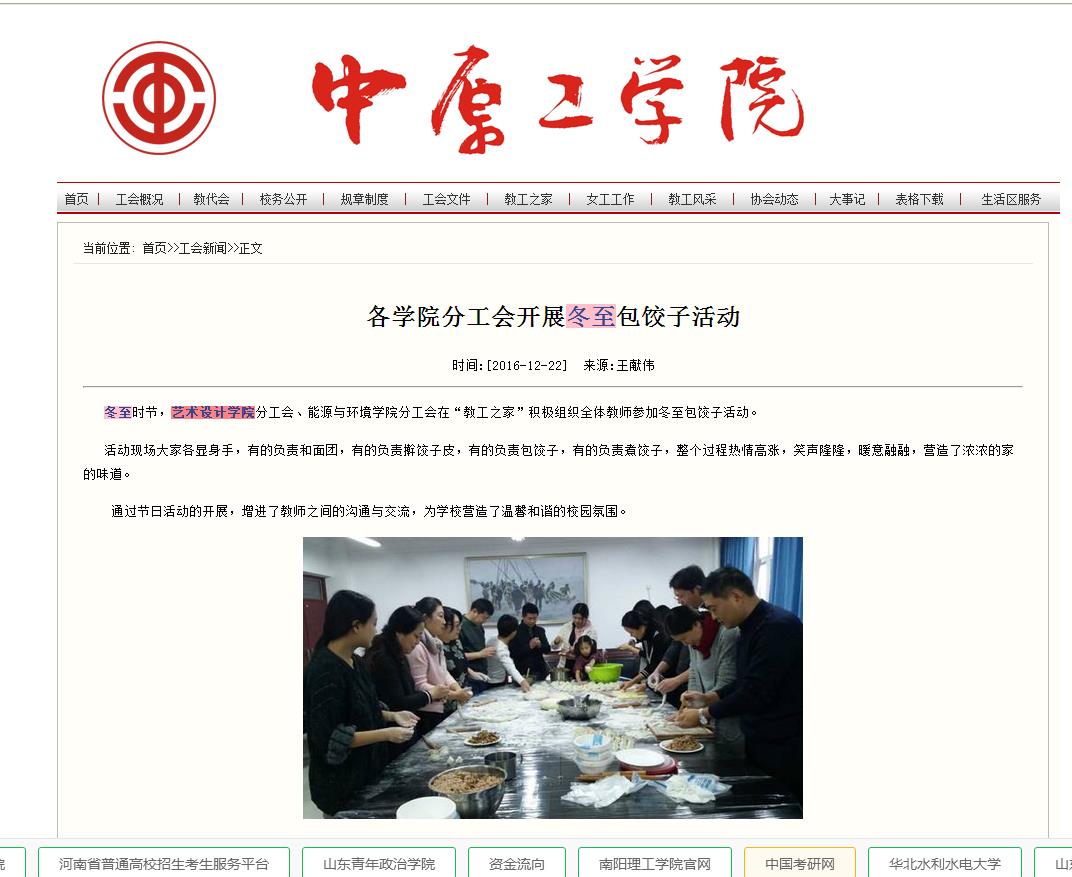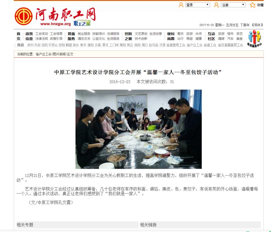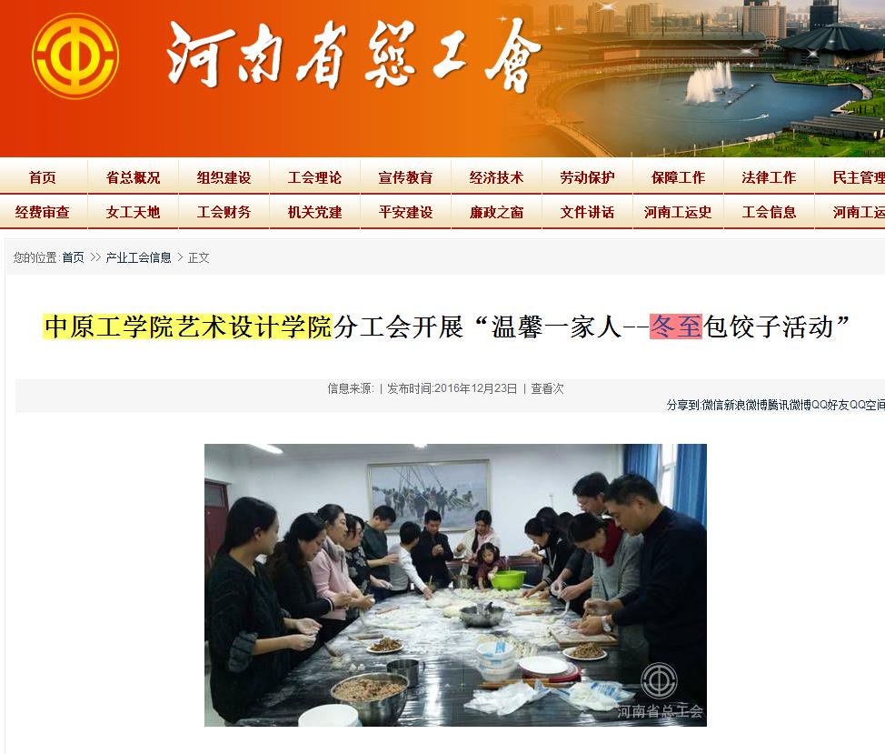 近日,河南总工会、河南职工网、中原工学院网三家媒体纷纷关注和报道艺术设计学院分工会开展“温馨一家人----冬至包饺子活动”。