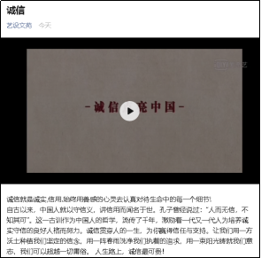 学院自制《诚信点亮中国》主题视频,投放在学院“艺设文苑”公众号上进行展播,以新媒体形式做好主题宣讲工作。这是我院首次以视频形式进行资助主题宣传,在视频构思、制作技术方面需要有进一步的提升。