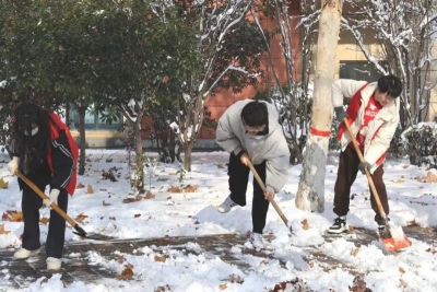 12月10日晚,2023年第一场大雪如约而至,令校园内外银装素裹。纷纷扬扬的雪花装扮了我们的校园,但积雪也给师生出行上课带来了诸多不便,埋下了安全隐患。校内的主干道及南苑、北苑操场存有厚厚的积雪,严重影响了校园师生的出行安全。