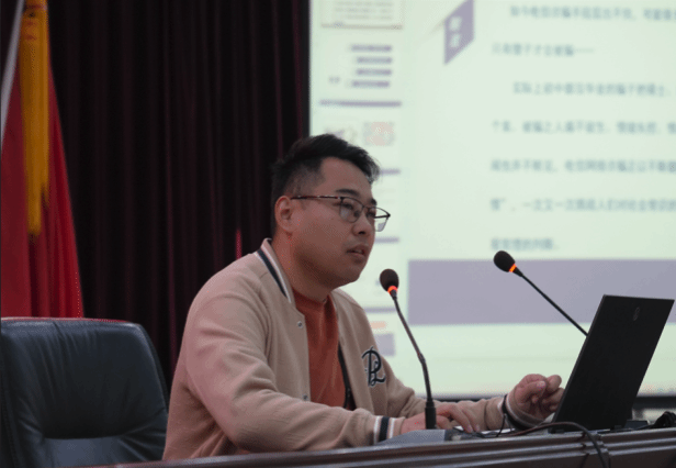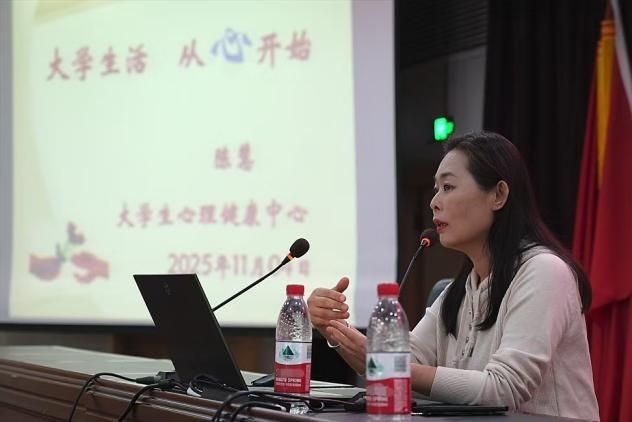 在心理健康教育环节,大学生心理健康中心主任陈慧以“大学生活,从心开始”为主题,结合新生群体心理发展特点展开讲解。她从认知调整、情绪管理、人际沟通等维度切入,深入分析新生当前面临的生活适应、学习转型等典型压力源,还通过“情绪色彩”图片案例及“心理健康自测”等互动环节,让学生们深度参与其中,并通过不同形式为大学生活“减压”。