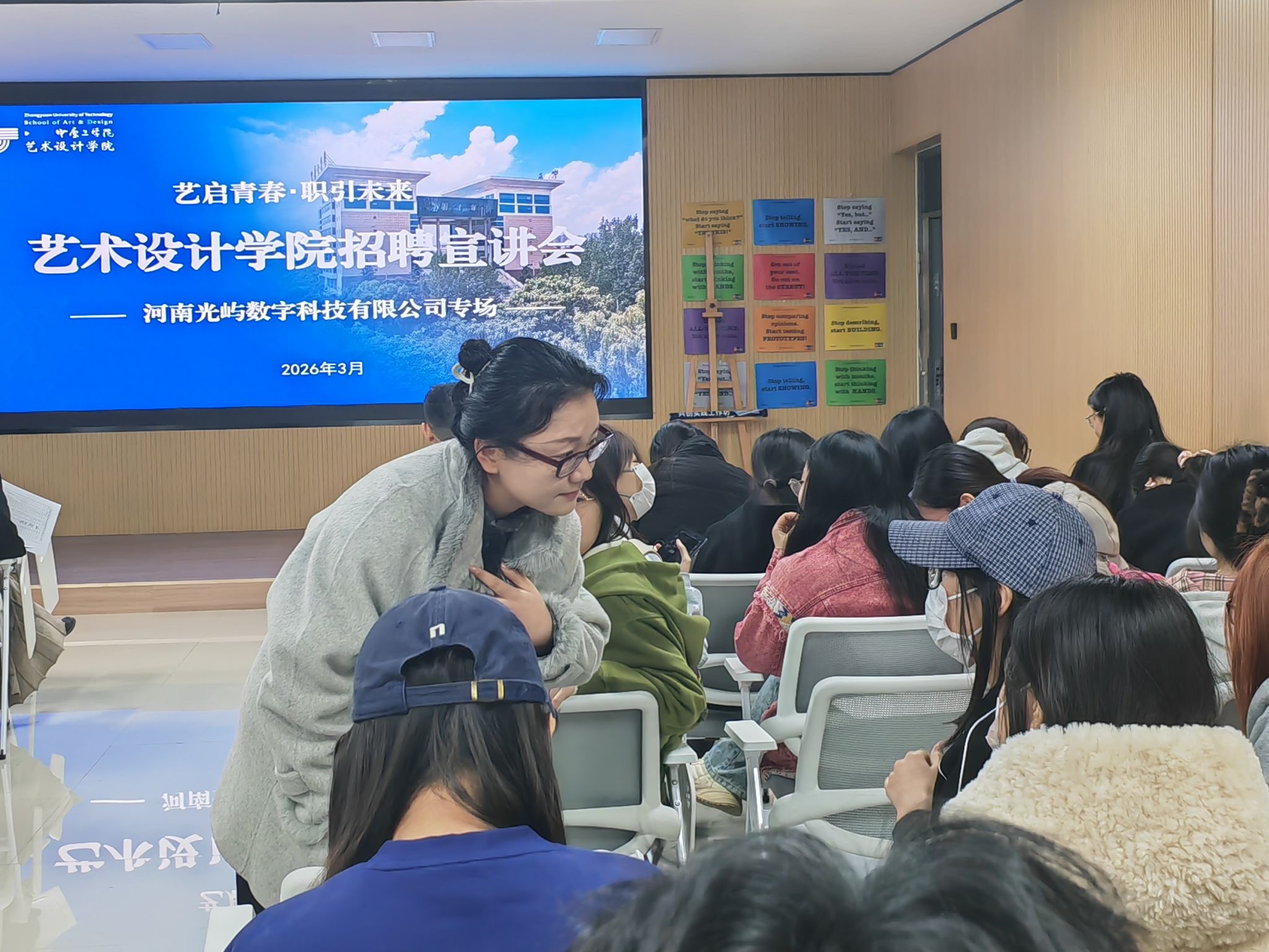 为推动毕业生精准对接优质企业资源,提升学生职业能力与就业竞争力。3月27日,艺术设计学院在3号组团楼D501举办河南光屿数字科技有限公司校园招聘宣讲会,视觉传达设计系主任陈伟利、动画系主任孙锐、毕业班辅导员孙沛及2026届毕业生参加活动。