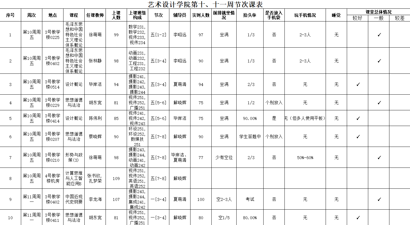 近日,学院辅导员深入教学楼多个班级,对课堂到课率、听课状态、课堂纪律及师生互动情况进行全面巡查。现场来看,大部分学生能够提前到达教室,课堂 状况 井然 有序 , 学生 听课专注度较高。任课教师授课内容充实、语言明确,教学节奏适中,整体教学氛围积极向上。辅导员通过实地观察,详细记录班级出勤、听讲状态等情况,对精神不集中、使用手机、随意讲话等现象进行提醒和 妥善 处理,做到课堂问题第一时间掌握 , 第一时间反馈。
